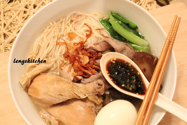 We have an unusually cold weather here in Michigan yesterday, the lowest it has got thus far (but then again the tough days are just about to start! grrrrrrrrrrr). Feeling all so sulky on the whole, I guess it's a thing good enough that I have this little craving left stirring in me still - chicken soup! This somen in pig maw and chicken soup 猪肚鸡汤寿面 is pretty much a fusion of my mom's chicken soup and my mom-in-law's somen. Mom's chicken soup comes with a whole chicken cut into pieces, a variety of mushrooms, and dried scallops - clear and yet so very flavorful and nutritious it makes itself such a great comfort food on its own. Mom-in-law's somen on the other hand, has always been the iconic dish at home (in which the noodle represents longevity in general) especially to the many auspicious days Chinese do celebrate - Chinese New Year and birthdays among the few. Served with pig maw soup with some greens, crispy fried seaweed and deep fried shallots, this is a tradition of the Putian people, or Xinghua 兴化人, a Han ethnic group from Putian, Fujian - dad-in-law's origin.